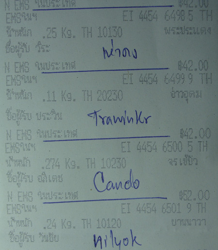 ได้จัดส่งของไปให้แล้ว 7/11/54 คาดว่าจะได้รับไม่น่าเกินวันพุธ นะครับ สำหรับในเขต กทม ที่มีปัญหาน้ำท่วม ได้โทรเช็คกับท่านที่จองที่ไห้เบอร์โทรติดต่อไว้ บางท่านก็ไห้จัดส่งได้เลย บางท่านฝากไว้ก่อน สำหรับท่านที่ไม่มีเบอร์ติดต่อ ก็จัดส่งไห้ ก่อนส่งก็สอบถามทางเจ้าหน้าที่ เขาบอกว่าในเขตที่มีปัญหาน้ำท่วมก็จะช้าหน่อย ถ้าจัดส่งผู้รับไม่ได้ของก็อยู่ทางไปรษณีย์สามารถติดต่อรับได้