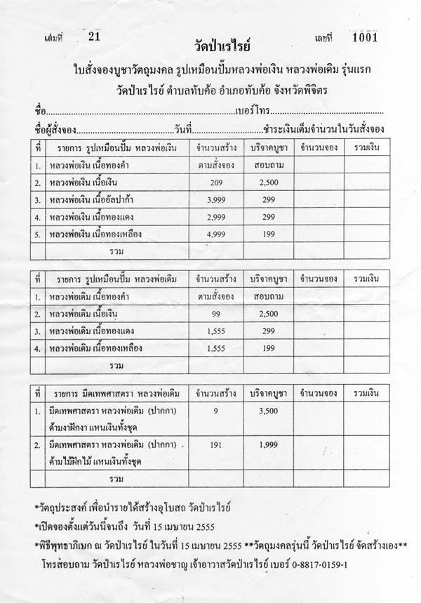 - วัตถุประสงค์ เพื่อนำรายได้สร้างพระอุโบสถ วัดป่าเรไรย์ ต.ทับค้อ อ.ทับค้อ จ.พิจิตร
