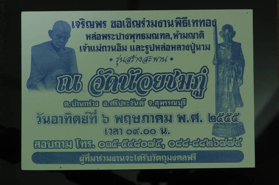 ส่วนวันที่ 6 พ.ค.55 ขอเชิญร่วมงานพิธีเททองหล่อพระปางพุทธมณฑล ห้ามญาติ เจ้าแม่กวนอิม และรูปหล่อหลวงปู่นาม "รุ่นสร้างสะพาน" |
