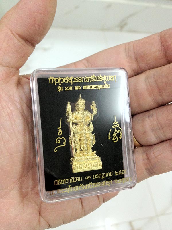 ผมได้นำรูปหล่อลอยองค์ท้าวเวสสุวรรณตรีพระเพลา เนื้อทองระฆัง โค้ดโสฬส ซึ่งจัดสร้างเพียง 699 องค์เท่านั้น บรรจุใส่กล่องพลาสติกสวยหรูซึ่งมีซองพลาสติกสวมให้อีกชั้นหนึ่ง (กันหน้ากล่องเป็นรอยขูดขีด) ยิ่งทำให้ดูสวยมากขึ้นไปอีกครับ