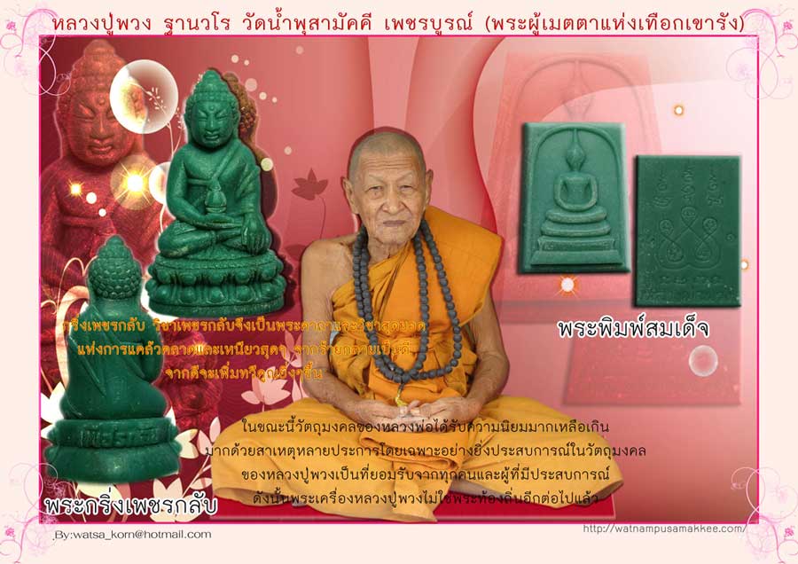 หลวงปู่พวง ฐานวโร วัดน้ำพุสามัคคี จ.เพชรบูรณ์ ทายาทอาคมขลัง หลวงพ่อทบ วัดชนแดน หลวงพ่อเขียน สำนักขุนเณร หลวงพ่ออ้วน วัดดงขุย หลวงปู่พวง เป็นพระที่เก่งแบบเงียบในพื้นที่มานานแล้ว ออกเหรียญรุ่นแรกมีประสบการณ์ดีและหายากมากลูกศิษย์ทั้งในและต่างประเทศต่างรีบเก็บกันจนไม่มีให้เห็นอีกเลย หลวงปู่พวง นับเป็นพระอริยสงฆ์อายุมากพรรษากาลที่สุดในจังหวัดเพชรบูรณ์ พระสงฆ์องค์เจ้า สมณะ ชี พราหม์ ชาวบ้านพ่อค้าแม่ขาย ข้าราชการทุกระดับชั้น ต่างให้ความเคารพหลวงปู่พวงเป็นอย่างมาก หากพูดถึงพระกริ่งเพชรกลับในสยามประเทศนี้ คงไม่พ้น พระกริ่งเพชรกลับหลวงพ่อทบวัดชนแดนที่โด่งดังลือชื่อในประเทศได้สร้างตามตำราพระกริ่งวัดสุทัศน์อันโด่งดังจึงได้ขลังเปี่ยมพลังพุทธคุณ พระกริ่งเพชรกลับ ไม่ใช่ใครอยากสร้างก็สร้างกันง่ายๆสร้างให้ดีทำยากเป็นของสูง หากสร้างต้องให้ใช้ได้ ใช้ดี มีอานุภาพ กลับร้ายกลายดี ถ้าดีให้ดียิ่งๆขึ้นไป พลิกชะตา ค้ำชูดวง ให้คุณ 108 ประการสุดจะตั้งจิตปรารถนา อาราธนาทำน้ำพุทธมนต์รดตัวแก้อาถรรย์ไล่สิ่งอัปมงคลขวากหนามตัดอุปสรรคหมดเคราะห์ให้เจริญรุ่งเรืองนำลาภสักการะมาสู่ผู้บูชาด้วยมนต์วิชาเพชรกลับมีคุณวิเศษนานับประการยากจะกล่าวได้ หลวงปู่พวงท่านได้บอกว่า หมดเคราะห์หมดกรรม ให้มีความเจริญ ยิ่งๆขึ้นไป