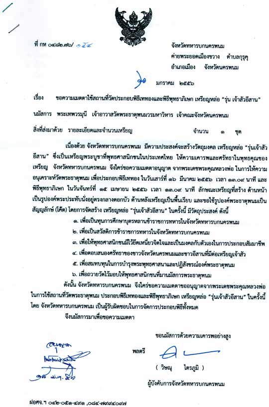 นับเป็นครั้งแรกที่ทางวัดพระธาตุพนม ที่ได้อนุญาตให้จัดสร้าง ทั้งเททองและมหาพุทธาภิเษก ณ องค์พระธาตุพนม ซึ่งเป็นที่สักการะบูชาของคนทั่วโลก สมควรที่เราท่านทั้งหลายต้องจับจองเป็นเจ้าของ บอกได้คำเดียวว่า สุดยอดทั้ง มวลสารและพิธี ทางผู้จัดสร้างได้นิมนต์เกจิคณาจารย์ทั่วทั้งภาคอีสาณ มาอธิฐานจิตวิทยาคมลงสู่เหรียญ"เจ้าสัวอีสาณ" เหรียญดี เหรียญสวย พุทธคุณล้นเหลือ เจตนาบริสุทธิ์ |