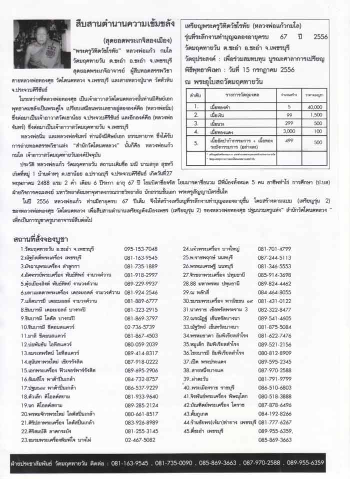 ...ในปี 2556 หลวงพ่อแก้ว ท่านมีอายุครบ 67 ปีเต็ม จึงได้จัดสร้างเหรียญเป็นที่ระลึกงานทำบุญฉลองอายุขึ้น เพื่อบูรณะศาลาการเปรียญ วัดมฤคทายวัน อ.ชะอำ จ.เพชรบุรี...