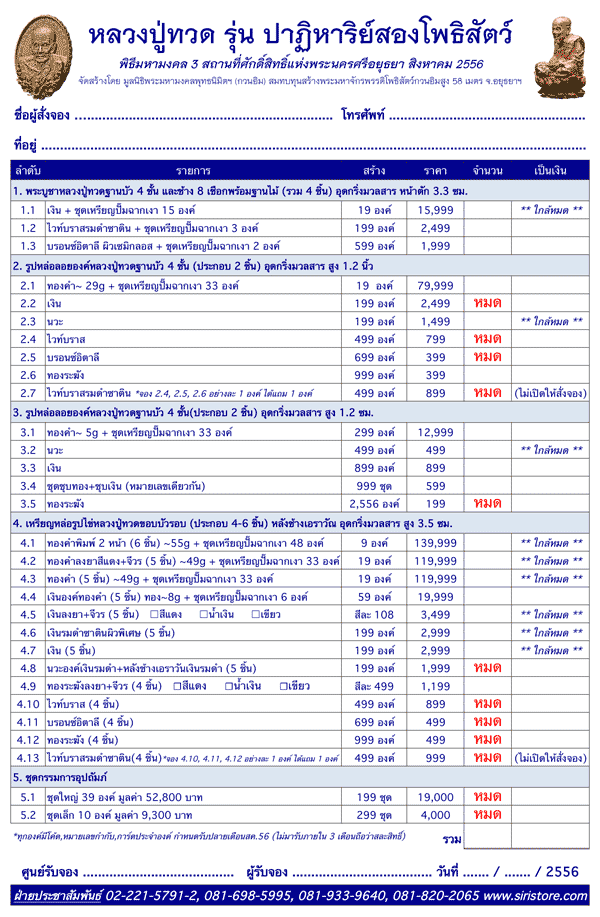 สำหรับรายการเหรียญเงินองค์ทองคำนี้จะมีองค์ลป.ทวดเท่านั้นที่เป็นเนื้อทองคำ นน.ประมาณ 8 กรัม ซึ่งเมื่อคิดเป็นราคาทองคำจะอยู่ที่ประมาณหมมื่นกว่าบาทแล้วครับ ยังไม่รวมตัวเหรียญซึ่งประกอบด้วยเนื้อเงินทั้งหมดอีก 4 ชิ้น (รวมทั้งหมดเป็นประกอบ 5 ชิ้น) และยังมีเหรียญปั๊มฉากเงาแถมให้อีก 6 องค์ มูลค่า 2,500 บาทอีกด้วย