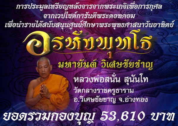 วันนี้วันแม่ผมได้พาคุณแม่ไปทำบุญที่วัดกลางราชครูธารามมาครับ เลยถือโอกาสนี้ให้คุณแม่เป็นตัวแทนถวายกองบุญที่พี่ๆ ในเวปแห่งช่วยสร้างครับ รายได้ทั้งหมดจากการประมูลการกุศลเหรียญอรหังพุทโธ เมตตาจารหลังเหรียญจากพระเกจิ เพื่อสนับสนุนศูนย์ศึกษาพระพุทธศาสนาวันอาทิตย์ วัดกลางราชครูธาราม อ.วิเศษชัยชาญ จ.อ่างทอง  |
