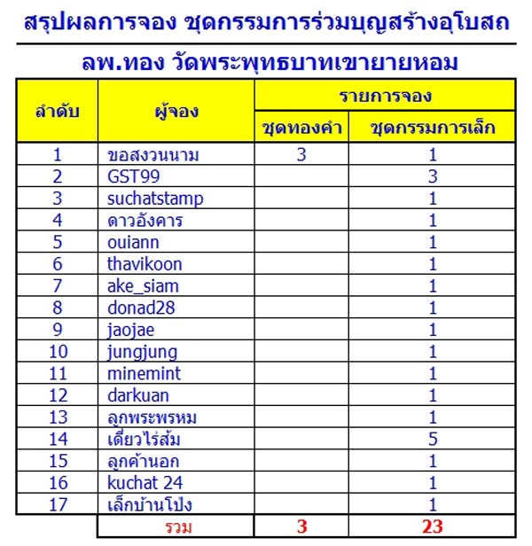 ผู้ที่สั่งจองชุดทองคำไว้ ผมขอสงวนนามไว้นะครับ เนื่องจากของมีมูลค่าสูง และคงไม่จัดส่งทาง ปณ.รายละเอียดผมจะประสานกับผู้สั่งจองอีกครั้งครับ