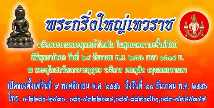 เปิดจองตั้งแต่วันที่ 9 พฤศจิกายน 2556 ถึงวันที่ 28 ธันวาคม 2556 และกำหนดรับพระวันที่ 1 มกราคม 2557 ถึงวันที่ 31 มีนาคม 2557 ติดต่อสอบถาม โทร. 022812430 |