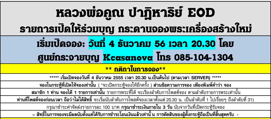 ขอแจ้งข่าวกำหนดเปิดจอง หลวงพ่อคูณ รุ่นปาฏิหาริย์ EOD "ศูนย์จอง kcasanova" รวมทั้งหมด 31 รายการ (รายละเอียดดังรูป)