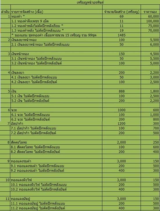 วันนี้ขอนำเสนอรายการจัดสร้างแบบพิมพ์อีก1พิมพ์เหรียญหน้าอรหันต์ในชื่อรุ่นอรหันต์91ซึ่งแบบเหรียญกำลังดำเนินการออกแบบอยู่ครับแต่รับรองว่าสวยโดนใจใครหลายๆคนแน่ทางวัดจะเปิดให้จองทั้ง 2 พิมพ์ได้ในเดือนหน้าครับขอให้อดใจรอก่อนครับส่วน รายนามศูนย์กระจายบุญจะประกาศให้ทราบในเร็ววันนี้ครับถ้าท่านใดสนิทกับศูนย์ใดขอเชิญติดต่อกันเนิ่นๆเลยครับทางวัดและคณะกรรมการขอขอบคุณและขออนุโมทนาบุญแก่ทุกๆท่านที่สนใจร่วมจองวัตถุมงคลกับทางวัดเพื่อนำรายได้ไปสร้างวิหารเป็นการจรรโลงพระพุทธศาสนาสืบต่อไป |