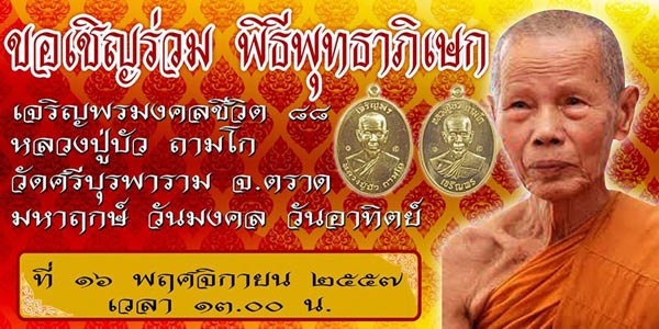 ขอเชิญร่วม พิธีพุทธาภิเษก เจริญพรมงคลชีวิต ๘๘ หลวงปู่บัว ถามโก วัดศรีบุรพาราม จ.ตราด มหาฤกษ์ วันมงคล วันอาทิตย์ ที่ ๑๖ พฤศจิกายน ๒๕๕๗ เวลา ๑๓.oo น.  |