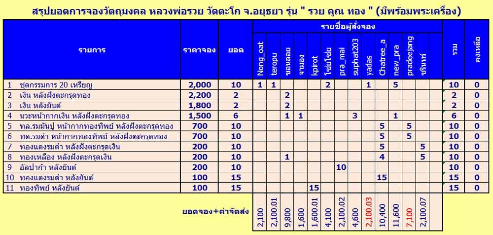 | หัวข้อกระทู้ : => สรุปผลการจอง วัตถุมงคล รุ่น รวย คูณ ทอง หลวงพ่อรวย วัดตะโก (มีพร้อมพระเครื่อง) |