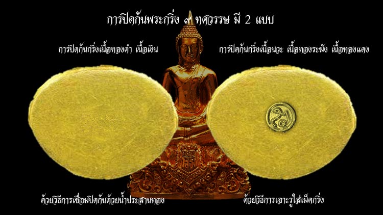 2. การปิดก้นกริ่ง ได้มีการเปลี่ยนแปลงวิธีการปิดก้น จากเดิมที่จะปิดก้นด้วยการเจาะรู และใส่เม็ดกริ่ง แล้วจึงปิดรูก้นกริ่ง ซึ่งการปิดก้นด้วยวิธีนี้ ทำได้เฉพาะพระกริ่งเนื้อนวะโลหะ เนื้อทองระฆัง และเนื้อทองแดง ส่วนพระกริ่งเนื้อทองคำ และเนื้อเงิน จะปิดก้นกริ่งด้วยวิธีการเชื่อมน้ำประสานทอง ด้วยเหตุนี้ จึงทำให้ขั้นตอนและกระบวนการผลิตต้องใช้เวลาในการทำงานมากขึ้นกว่าเดิม ซึ่งเป็นสิ่งที่ไม่คาดคิด แต่ต้องทำเพื่อให้งานพระกริ่งออกมาสวยสมบูรณ์ทุกองค์ ครับ