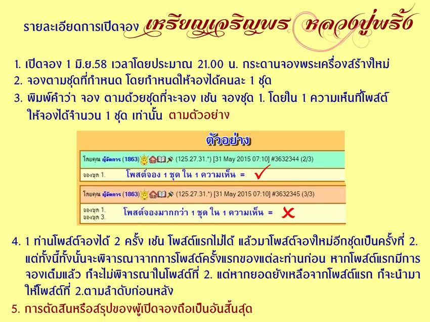 | หัวข้อกระทู้ : => รายละเอียดการเปิดจอง เหรียญเจริญพร หลวงปู่พริ้ง วัดซับชมพู่ คืนนี้ 1/6/58 เวลา 21.00 น. |