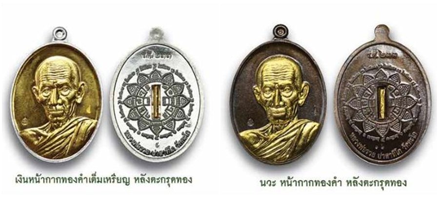 ซ้ายมือ คือเหรียญเงินหน้ากากทองคำเต็มเหรียญ หลังตระกรุดทองคำ มูลค่า 10,000 บาท