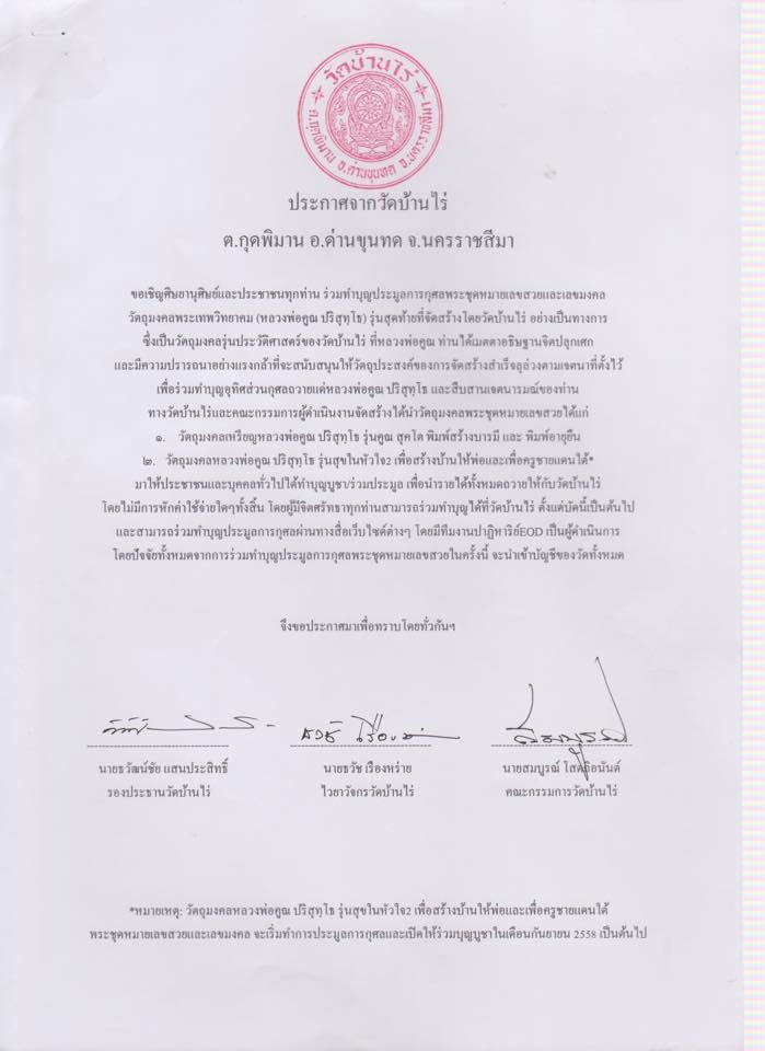 สำหรับศิษยานุศิษย์ทุกท่านที่สนใจสามารถร่วมทำบุญได้ที่วัดบ้านไร่ ตั้งแต่บัดนี้เป็นต้นไป