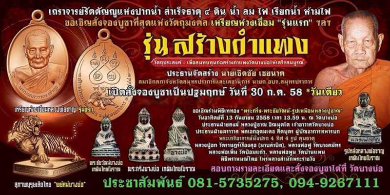 เปิดจองพร้อมกันทั่วประเทศครับ!!! สำหรับ รุ่นสร้างกำแพง งานนี้ งานบุญใหญ่ ของวัดบางบ่ออีกรุ่นครับ รูปแบบออกมาหมดทุกพิมพ์แล้ว เนื่องด้วยกำแพงวัดบางบ่อ ยังต้องการเงินจำนวนมากเพื่อการซ่อมแซมและทำนุบำรุงกำแพงแก้วรอบวัด ซึ่งจำเป็นต้องหาเงินเพื่อใช้ในการก่อสร้างจำนวนมาก ทางผู้ใหญ่หลายๆท่านจึงได้ปรึกษากันขึ้นเพื่อหาวิธีการ และได้ลงความคิดเห็นว่าจะสร้างวัตถุมงคลขึ้นมาอีกรุ่นหนึ่งเพื่อหาเงินไปใช้สร้างกำแพงแก้วในส่วนนี้ จึงตั้งชื่อรุ่นนี้ว่า "รุ่นสร้างกำแพง"