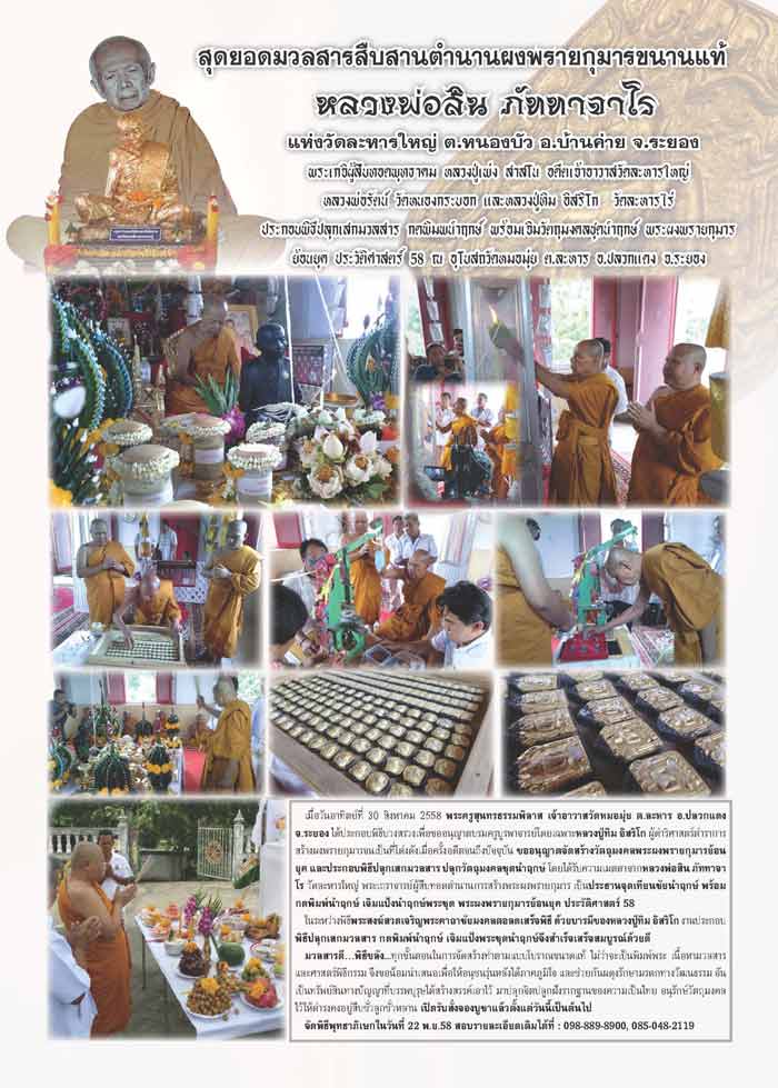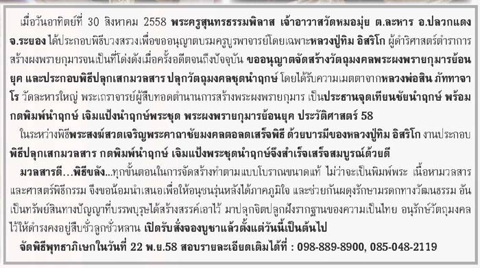 พิธีกดพิมพ์นำฤกษ์ พระผงพรายกุมารย้อนยุค ประวัติศาสตร์ ๕๘ ณ วัดหมอมุ่ย ต.ละหาร อ.ปลวกแดง จ.ระยอง เมื่อวันที่ 30 สิงหาคม58 ที่ผ่านมา โดยได้รับความเมตตาจากหลวงพ่อสิน วัดละหารใหญ่ เป็นประธานจุดเทียนชัยนำฤกษ์ กดพิมพ์นำฤกษ์พร้อมเจิมบล็อก เจิมพระนำฤกษ์ทุกองค์ทุกพิมพ์ของพระชุดนี้ สุดยอดของดีที่มีพิธีตามแบบโบราณ จึงไม่ควรพลาดโอกาสที่จะได้มาไว้ครอบครอง |