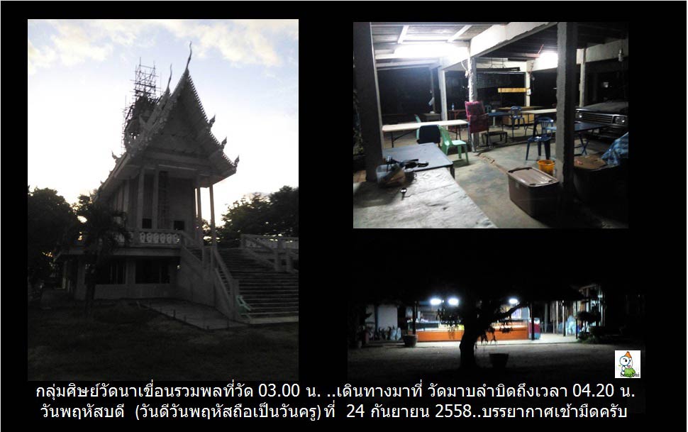 เช้ามืดวันพฤหัสบดีที่ 24 เริ่มเวลา 03.00 น. กลุ่มลูกศิษย์ วัดนาเขื่อน ได้รวมพลที่วัดนาเขื่อน ขนวัตถุมงคล มาที่วัดมาบลำบิด เพื่อให้ หลวงปู่ ฮก ปลุกเสกเป็นปฐมฤกษ์...มาถึงวัดมาบลำบิด 04.20 น. |