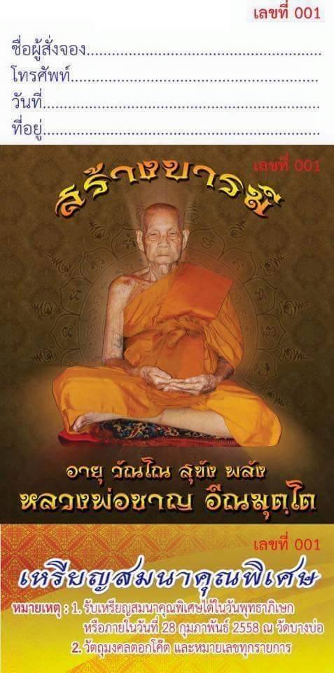 โดยสามารถรับเหรียญได้ในวันพิธีพุทธาภิเษกหรือภายในวันที่ 28 กุมภาพันธ์ 2559 ณ วัดบางบ่อ