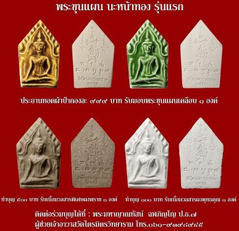 4. พระขุนแผน นะหน้าทอง เนื้อผงพราย จำนวน 999 องค์ มอบให้เป็นที่ระลึกแด่ผู่ร่วมบุญรองประธานผ้าป่า 1 กอง กองละ 499 บาท