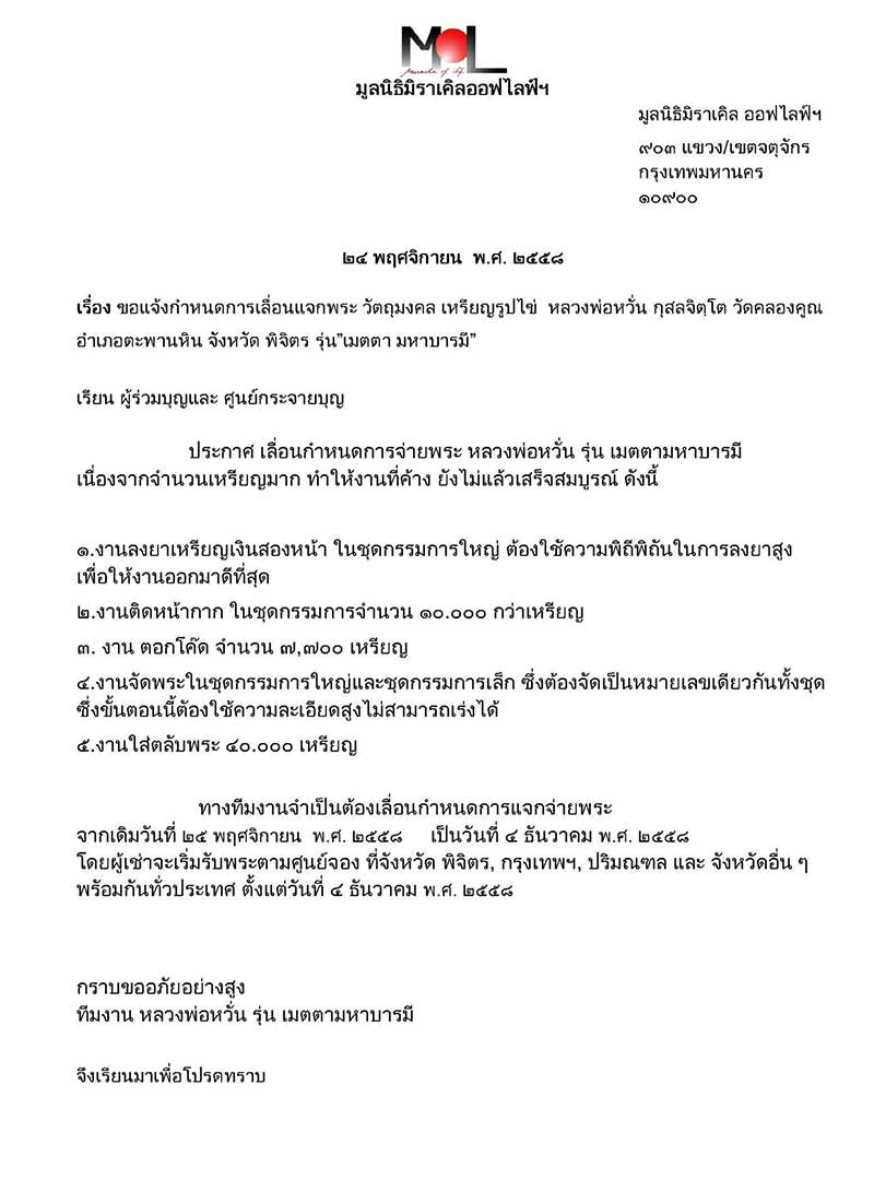 ประกาศ เลื่อนกำหนดการจ่ายพระ หลวงพ่อหวั่น รุ่น เมตตามหาบารมี