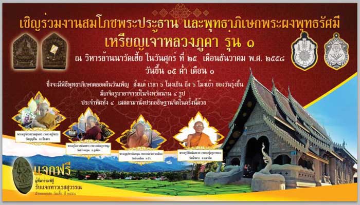 ขอเชิญร่วมงานสมโภชพระประธาน และพุทธาภิเษกพระผงพุทธรัศมี เหรียญเจ้าหลวงภูคา รุ่น ๑ ณ วิหารล้านนาวัดเฮี้ย ในวันศุกร์ ที่ ๒๕ เดือนธันวาคม พ.ศ. ๒๕๕๘ วันเพ็ญ ขึ้น ๑๕ ค่ำ เดือน ๑ ที่จะมาถึงนี้ ซึ่งจะมีพิธีพุทธาภิเษกตลอดคืนวันเพ็ญ ตั้งแต่ เวลา ๖ โมงเย็น ถึง ๖ โมงเช้า ของวันรุ่งขึ้น