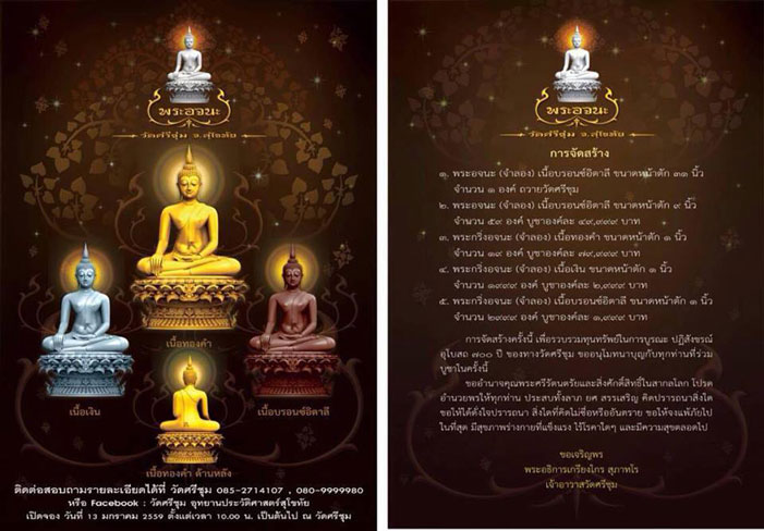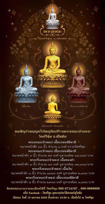 ขอเชิญพุทธศาสนิกชนชาวไทยทั่วประเทศ ร่วมงานบุญบูรณะปฎิสังขรณ์อุโบสถ 700 ปี ที่ วัดศรีชุม อ.เมือง จ.สุโขทัย ซึ่งเป็นวัดเก่าแก่สำคัญของจังหวัดสุโขทัย พร้อมร่วมบุญบูชาพระกริ่งพระอจนะ (รุ่นแรก) โดยมีพระเจ้าหลานเธอ พระองค์เจ้าอทิตยาทรกิติคุณ ทรงร่วมพิธีเททองหล่อพระอจนะ(จำลอง)และวางศิลาฤกษ์อาคารปฏิบัติธรรม"มหาคุณ"ในวันพุธที่ 13 มกราคม พ.ศ.2559 เวลา15:00 น.