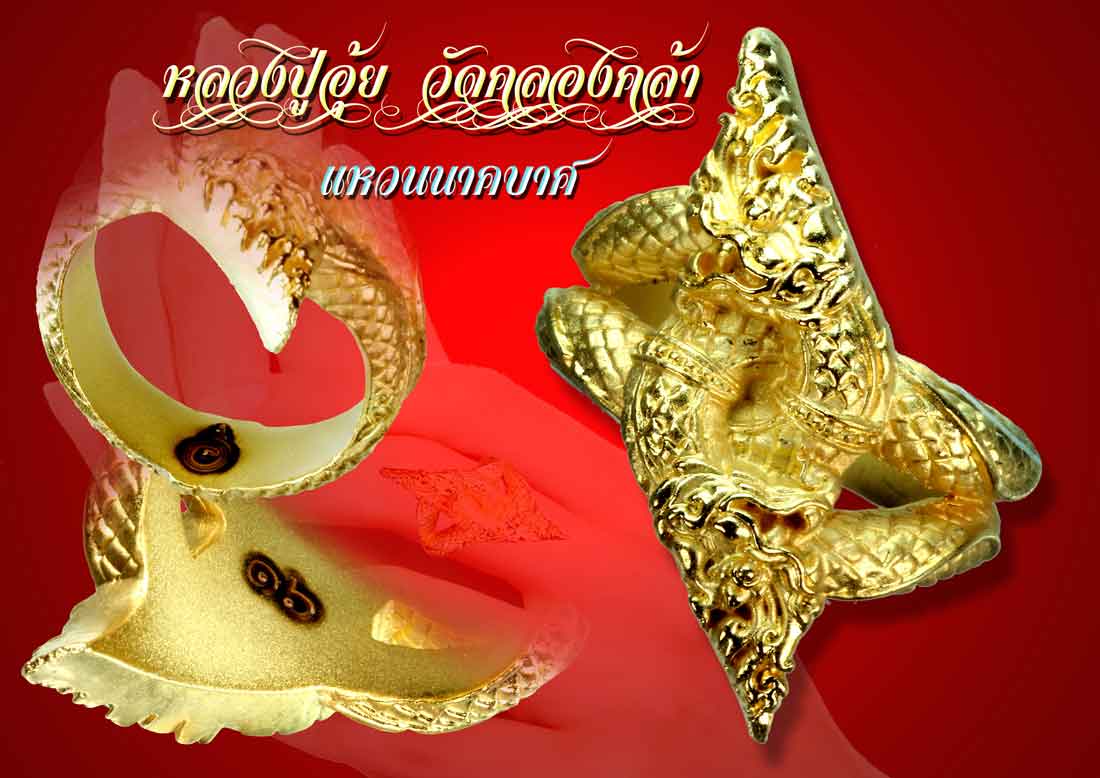 แหวนนาคบาศ กินไม่ไหว ใช้ไม่หมด อดไม่เป็น หล่อหลอมจากชนวนโลหะสำริดเก่า ขันน้ำมนต์ ระฆังแตก แท่งชนวนเก่าของพระอุปคุตุร่นแรกหลวงปู่อุ้ย แท่งชนวนพระกริ่งหลวงพ่อเขียน สำนักขุนเณร และแท่งชนวนพระกริ่งเพชรกลับหลวงพ่อพวง วัดน้ำพุ ท่านใดมีแหวนนาคบาศพกพาติดตัวอยู่เสมอ ต้องการสิ่งใดขอให้นึกถึงพญานาคราชผู้เป็นใหญ่ใต้บาดาลและหลวงปู่อุ้ย ศิริปัญโญ ผู้จัดสร้างแหวนบ่วงนาคบาศ อิทธิคุณที่หลวงปู่อุ้ยปลุกเสกลงไว้ ทางทำมาหากิน มีโชคมีลาภ มหาเสน่ห์มหานิยม ป้องกันภัย ชนะทุกอย่าง เจริญรุ่งเรือง ซื้อง่ายขายคล่อง กินไม่ไหว ใช้ไม่หมด อดไม่มี เป็นเศรษฐีมหาเศรษฐี มั่งมีตลอดจนถึงพระนิพพาน สามารถใช้ทำน้ำมนต์ เสริมดวง ป้องกันภูตผีและคุณไสย เป็นเมตตามหานิยมแคล้วคลาดปลอดภัย บ่วงนาคบาศนี้พญาครุฑเจ้าแห่งนกยังกลัวเกรง บูชาด้วยความเคารพ จะมีความเป็นอยู่ที่อุดมสมบูรณ์ ชุ่มฉ่ำเย็นเหมือนมีนาคมาอยู่ด้วย ถือว่าเป็นของดีหายาก สมกับเป็นของขวัญปีใหม่ 2559 ที่หลวงปู่อุ้ยจัดสร้างเป็นพิเศษ ให้มี 2 ขนาดสำหรับผู้ชาย และ ผู้หญิง / เนื้อเงินรมดำ ผู้ชายสร้าง 25 วง ผู้หญิงสร้าง 25 วง บูชาวงละ 2500 บาท / เนื้อมหาชนวนชุบเงิน ผู้ชายสร้าง 98 วง ผู้หญิงสร้าง 98 วง บูชาวงละ 399 บาท / เนื้อมหาชนวนชุบทองโกลเด้น ผู้ชายสร้าง 92 วง ผู้หญิงสร้าง 98 วง บูชาวงละ 399 บาท / เนื้อมหาชนวนชุบทองประกาย ผู้ชายสร้าง 196 วง ผู้หญิงสร้าง 200 วง บูชาวงละ 399 บาท / เนื้อมหาชนวน ผู้ชายสร้าง 299 วง ผู้หญิงสร้าง 299 วง บูชาวงละ 299 บาท