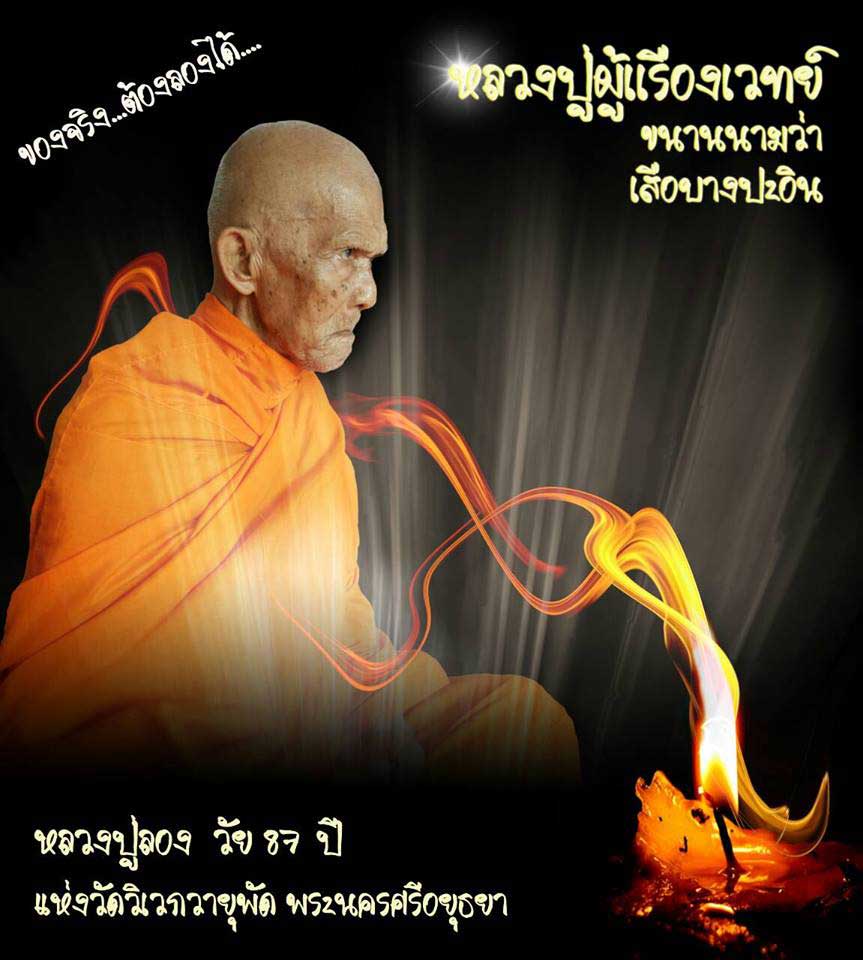 ดั่งชื่อลือนาม " เสือบางปะอิน " หลวงปู่ลอง แห่งวัดวิเวกฯ พระนครศรีอยุธยา ชื่อนี้กล่าวขานกันมายาวนาน หลวงปู่ทิม วัดพระขาว ยอมรับนับถือ บอกให้ลูกศิษย์มากราบให้ได้ ...หลวงพ่อมี วัดมารวิชัย บอกนี่แหละเสือบางปะอิน พวกเอ็งจงไปดูด้วยสองตา ...หลวงพ่อชื้น วัดญาณเสน บอกศิษย์ใกล้ชิดอย่าลืมไปหาของดีกันนะที่วัดวิเวก ...หลวงปู่ดู่ วัดสะแก องค์นี้ข้างในเป็นทองสุกเชียวเอ็ง ข้าเคยเห็นท่านหลายทีแล้ว ท่านมานี่บ่อย ..... ครูบาอาจารย์หลายองค์เรียกขานนาม หลวงปู่ลองเสือบางปะอิน ถือว่าไม่ธรรมดาจริงๆ ต้องมีอะไร เป็นแน่ !! เดี๋ยวนี้ใคร ไม่รู้จัก หลวงปู่ลอง แห่งวัดวิเวกวายุพัด ไม่มีแล้ว เพราะ หลวงปู่สร้างของออกมาแต่ละอย่าง ทั้งขลังทั้งโดนใจ ติดอกติดใจ ขนานนามกันว่าเสือแท้แห่งบางปะอิน คนแห่มาเช่าพระกับหลวงปู่ แทบทุกวัน หลวงปู่ลอง คนจริง วัย 85 ปี คนพระประแดง หนุ่มเนื้อหอม นักเลงหนังเหนียว ถึงกระดูก หลานแท้ๆ หลวงปู่พริ้ง วัดบางปะกอก ครอบครูหลวงให้ตั้งแต่เด็ก หลวงปู่พริ้ง ปั้นลูกอมลูกยอดให้กินตั้งแต่ 5 ขวบ บอกนี่แหละของดีวิชาทั้งนั้น ต่อไปจะเก่งไม่แพ้ใคร จิตจะสุกสว่าง ร่างจะคงเหนียว สมัยสงครามโลกเครื่องบินทิ้งระเบิด ลงตรงไหนตายตรงนั้น ไม่มีใครรอด หลวงปู่ลองรอดมาแล้ว ระเบิดด้าน! มีครูดีหลวงปู่พริ้งเป่าพระหม่อมให้วิชา หลวงปู่พริ้ง วัดบางปะกอก เกจิดังอินโดจีน กรมหลวงชุมพรเขตอุดมศักดิ์ถวายตัวเป็นศิษย์ให้ความเลื่อมใสนำพระโอรสมาบวชถึง 3 พระองค์ หลวงปู่พริ้งอภินิหารมีมาก เสกเสื้อยันต์กระพือว่อนในโบสถ์ โด่งดังตั้งแต่อดีตจนถึงปัจจุบัน ได้หลวงปู่ลอง หลานแท้ๆสืบวิชา วิชาจึงไม่สูญ หลวงปู่พริ้งให้กินข้าวก้นบาตรตั้งแต่เด็ก โตมาจึงได้ของดีมาเยอะ มีวิชาพอตัว เริ่มเป็นหนุ่มจึงมีนิสัยไม่กลัวใคร หลวงปู่ลองได้ศึกษาวิชาอาคมเสกข้าว เสกน้ำ เสกแป้ง พุทธคุณด้านเสน่ห์เมตตามหานิยม จึงลือกันว่าท่านเป็นหนุ่มเนื้อหอม นักเลงหนังเหนียว สมัยหนุ่มๆยังไปเรียนวิชากับหลวงพ่อโอภาสี ที่วัดบวร หลวงพ่อโอภาสีล่องหนหายตัวได้วิ่งตามท่านไม่ทัน เกิดศรัทธาตามหลวงพ่อไปฝึกเตโชกสิณที่อาศรมบางมด พอโตเป็นทหารออกศึก รบสงครามหลายสมอรภูมิ ชนะทุกสมรภูมิเดือด ใช้ชีวิตทางโลกจนเบื่อ ออกบวช และเดินธุดงค์ตลอด มาอยู่วัดวิเวกวายุพัด ตั้งนานอยากบูรณะวัดวาจึงได้ทำของขลังของดีให้คนใช้ เพื่อว่าเขาจะได้กลับมาช่วยวัด ตอนแรกๆ คนไม่รู้จักท่าน ท่านสร้างอะไรมาก็เฉยๆ ไม่สนใจ แต่พอได้ใช้ของท่านเท่านั้น สุดยอดจริงๆ |