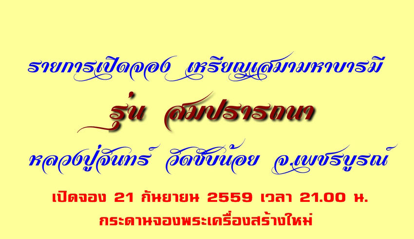 โดยในส่วนของผม มีพร้อมพระเครื่อง จะทำการเปิดจอง ในวันพุธ ที่ 21 กันยายน 2559 เวลา 21.00 น. กระดานจองพระเครื่องสร้างใหม่ครับ