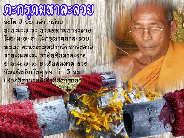 ตะกรุดมหาละลวยเป็นวิชาเสน่ห์เมตตานิยมขั้นสุดยอด หลวงพ่อเริ่มปลุกเสกฤกษ์เสน่ห์แรงๆ คือ จันทน์ซ้อนจันทน์ ซึ่งเป็นวันที่พระจันทน์เต็มดวงในวันจันทน์ ซึ่งถือว่าเป็นวันมงคล ตะกรุดนี้เป็นสุดยอดมหาเสน่ห์ เมตตามหานิยม มีเสน่ห์ต่อเพศตรงข้าม จะเดินทางไปไหน สอบสัมภาษณ์จะไม่มีใครเกลียด ผู้ที่พบเห็นจะพูดด้วยความนิยมชมเชย ศัตรูจะกลับกลายเป็นมิตร สามารถเปลี่ยนเรื่องร้ายให้กลายเป็นดี หรือติดต่อธุรกิจ เจรจาค้าขาย หากต้องการขายสินค้าดีให้นำตะกรุดแช่ในขันล้างหน้าและนำมาประพรมสินค้า ผู้คนจะอุดหนุนกันเนืองแน่นจะมีเงินไหลมาเทมา ด้วยอานุภาพพลังความศักดิ์สิทธิ์ที่แฝงเร้นอยู่ใน "ตะกรุดมหาละลวย" นี้ บริกรรมพระคาถา 3 จบ พร้อมกับนำตะกรุดวนที่ใบหน้าจนกว่าจะบริกรรมเสร็จ เมตตามหานิยม มหาเสน่ห์ต่อผู้ที่พบเห็น รำลึกถึงจิตใจฝักใฝ่อย่างมิรู้ลืม หากปรารถนาผู้ใดให้เขียนชื่อ วัน เดือนปีเกิดลงในใบรักซ้อน แล้วม้วนใสในรูตะกรุด นำไปไว้ใต้หมอน นอนบริกรรมภาวนาคาถาไปจนหลับ กระทำจนครบ 2 วัน แล้วเดินทางไปหาคนที่เรารักชอบจะประสบความสำเร็จดีนัก เมื่อสำเร็จแล้วต้องรับผิดชอบ ห้ามทอดทิ้ง ห้ามทำทดลองเล่นๆ เป็นอันขาดเพราะอาถรรพ์แรงมาก (คำสาบอาถรรพ์ห้ามผิดศีลข้อ 5 และทอดทิ้งถึงขนาดตกนรกหมกไหม้เลยทีเดียว) ขนาดความยาวของตะกรุด 2 นิ้ว สร้างจากแผ่นตะกั่ว จารยันต์มหาเมตตา ม้วนกรึงตะกรุดด้วยมนต์เสน่ห์เทพรำลึก ถักเชือกลงรักปิดทองแท้ พร้อมตอกโค๊ดและหมายเลขกำกับทุกดอก |