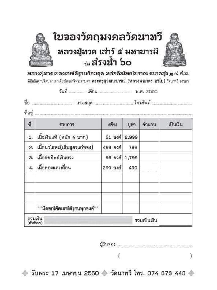 รายชื่อศูนย์จอง หลวงพ่อทวด เลขใต้ฐาน "เสาร์๕" วัดนาทวี จังหวัดสงขลา