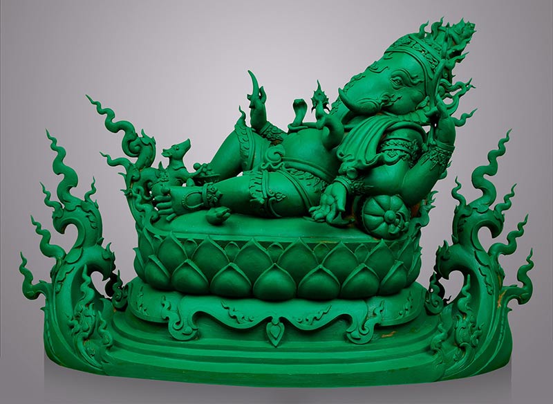 ประติมากรรมชิ้นนี้ ผมต้องการถ่ายทอดเทวลักษณ์ของมหาเทพ ให้ผู้คนที่พบเห็น มองเเล้ว รู้สีกถึงความผ่อนคลาย คลี่คลายสิ่งที่ทุกข์ร้อนภายในใจ ออกมาในรูปเเบบขณะบรรทม พร้อมกับการเสวยอาหาร ซึ่งเสมือนอยู่ในช่วงอารมณ์ที่ผ่านพ้นอุปสรรคหรือภาระมากมาย จนสำเร็จดั่งที่มุ่งหมายไว้เข้าสู่ช่วงเวลาเเห่งการเฉลิมฉลองพร้อมกับบริวาร คือหมูมุสิกะ เปรียบดังบริวาร เพื่อนพ้อง ทุกคน ที่เข้ามามีส่วนรวม ในการฉลองชัยชนะครั้งนี้ อีกด้วย