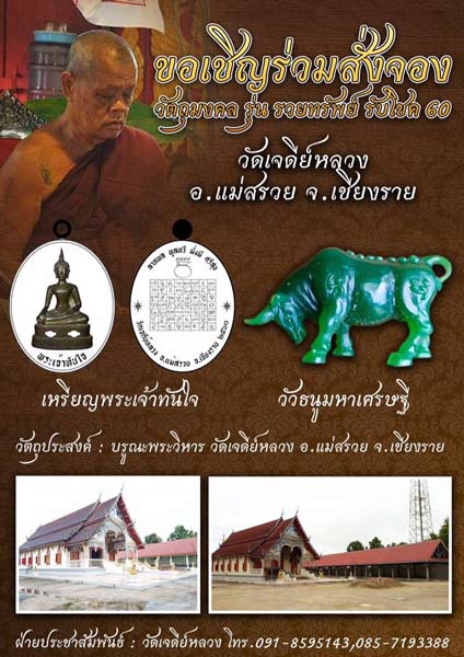 ขอเรียนเชิญพี่น้องร่วมสั่งจองทำบุญ วัตถุมงคลชุดแรกของทางวัดเจดีย์หลวง อ.แม่สรวย จ.เชียงราย เพื่อนำรายได้บรูณะพระอุโบสถหลังเก่าเพื่อความมั่นคง และศาลาที่ยังจะสร้างยังไม่เสร็จ