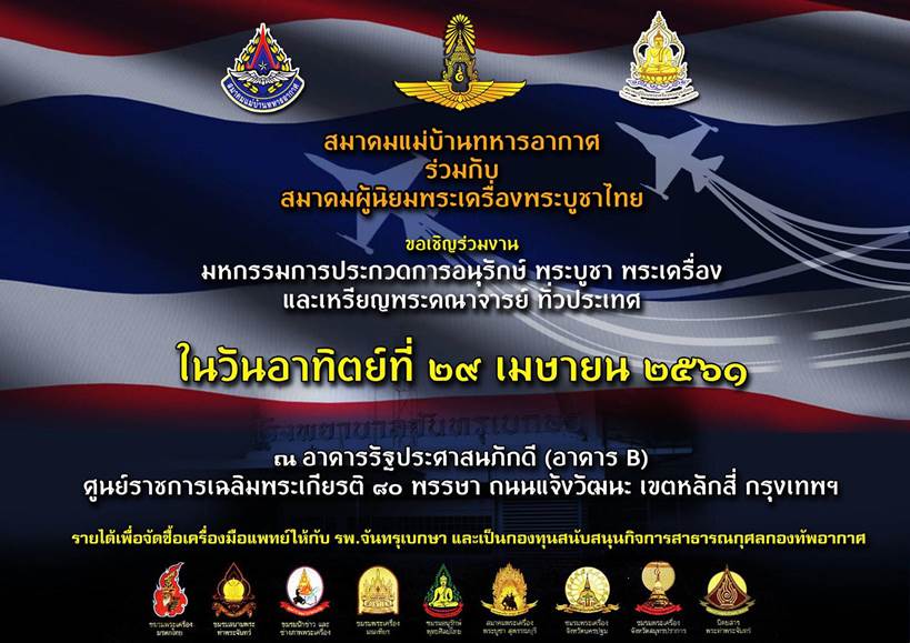 ขอเชิญร่วมงานมหกรรมการประกวดการอนุรักษ์พระบูชา พระเครื่อง เเละเหรียญคณาจารย์ทั่วประเทศ จัดโดยสมาคมเเม่บ้านทหารอากาศ เพื่อหารายได้สมทบทุนจัดซื้อเครื่องมือเเพทย์ให้กับโรงพยาบาลจันทรุเบกษา ในวันอาทิตย์ ที่ 29 เมษายน 2561 ณ อาคารรัฐประศาสนภักดี (อาคารB) ศูนย์ราชการเฉลิมพระเกียรติ 80 พรรษา ถนนเเจ้งวัฒนะ เขตหลักสี่ กรุงเทพฯ |