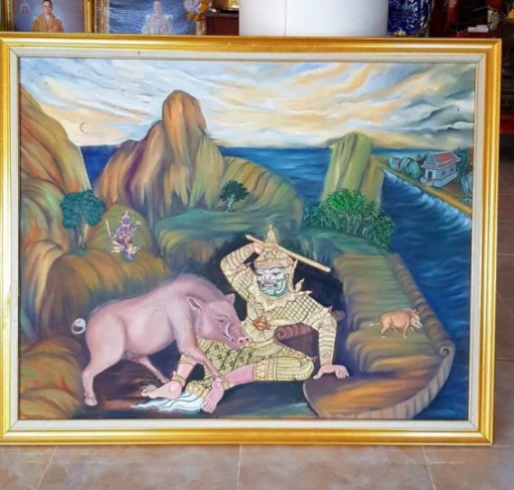 (พระนารายณ์อวตาร) ตามตำนานโบราญนารายณ์ 10 ปาง นั้นกล่าวไว้ว่ากาลก่อนโน้น หิรัณยากษะหิรัญยักษ์ ได้ซึ่งมาม้วนแผ่นดินทั้ง 4 ทวีปไปทิ้งบาดาลเพื่อให้โลกคงอยู่จนเวลานี้ โลกในตอนนั้นพื้นดินแผ่นดินหาไม่มี เพราะแผ่นดินจมหายลงไปใต้มหาสมุทร เพราะฝีมือยักษ์ โลกทั้งหลายจึงอ้างว้างมีแต่น้ำ เมื่อโลกจมอยู่ใต้น้ำมหาสมุทร พระนารายณ์ใคร่จะเลี้ยงโลกให้มีความสุขเช่นกาลก่อนจึงทรงอวตารเป็นวราห์ หรือหมูกายสิทธิ์สีดำร่างใหญ่สิบโยชน์ สูง100โยชน์ เขี้ยวยาวแหลม แสงเนตรดั่งฟ้าแลบ มีควันออกจากกายตัว วราหาวตารออกท่องเที่ยวไปเพื่อหาแผ่นดินให้มนุษย์ อยู่อาศัย และในที่สุดก็มาพบผืนแผ่นดิน วราหาวตารหมูใหญ่จึงเอาเขี้ยวขุดดันแผ่นดิน บัดนั้น หิรัญยักษ์ ยักษ์ร้ายจึงร้องห้ามมิให้หมูอย่าขุดเอาแผ่นดินไป เพราะว่ายักษ์ไม่ต้องการให้มนุษย์ อยู่อาศัยในแผ่นดิน หมูจึงตอบว่า เจ้ายักษ์ร้ายชาติก่อนเจ้าเป็นนายทวาร เฝ้าประตูพระวิษณุครั้น ฤาษีมาเข้าเฝ้า ยักษ์ร้ายก็ทำการหยาบคาย จึงถูกฤาษีสาปให้ไปเกิดเป็นยักษ์ ครั้นบัดนี้ถึงเวลาจะได้ไปเกิดแล้ว เจ้าอย่าได้มากีดกั้นขัดขวางทางเลย