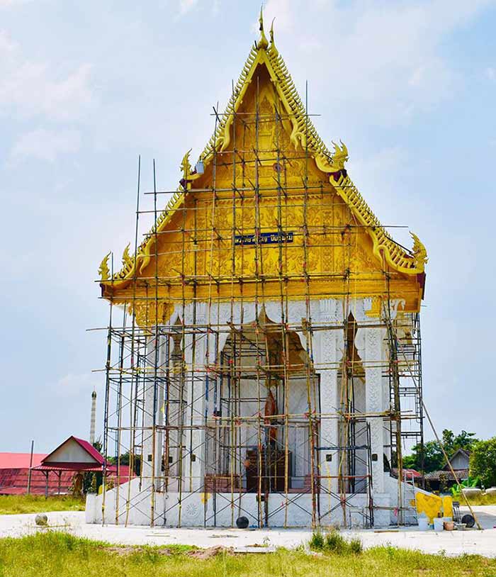 พระอุโบสถทรงสวยเด่นในป่าใหญ่ เริ่มก่อร่างสร้างฐานในขึ้นในปี2553 หลวงพ่อตั้งจิตแน่วแน่จะสร้างพระอุโบสถเพื่อให้สาธุชนชาวบ้านไว้เป็นที่ประกอบพิธีกรรมทางพุทธศาสนา ถึงแม้ทางวัดจะมีงบน้อยก็ตาม หลวงพ่อเล่าว่าในตอนที่เริ่มก่อสร้างนั้น หลวงพ่อมีเงินอยู่แค่สามหมื่นบาท แค่จ้างรถมาขุดสระเอาดินมาถมที่แล้วจ้างคนขุดหลุมฐานรากเงินก็หมดแล้ว ทำได้แค่นั้นหลวงพ่อก็หยุดเพราะเงินหมด หลวงพ่อบอกว่าเราต้องเริ่มต้น ถ้าไม่เริ่มทำก็ไม่มีวันแล้วเสร็จ ทำได้แค่ไหนก็แค่นั้น หมดงบก็หยุด มีงบก็ทำต่อ หลังจากนั้นก็มีผู้ใจบุญนำเงินมาทำบุญ เอาหินเอาปูนเอาทรายมาถวาย ท่านก็ดำเนินงานต่อ ทำมาเลื่อยๆ เมื่อมีงานทอดกฐินประจำปีก็จะได้เงินทำบุญเยอะหน่อยก็สร้างต่อ ทำมาแบบนี้เลื่อยมา |