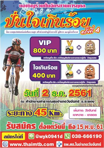 ขอเชิญร่วมปั่นจักรยานการกุศล "ปั่นใจเกินร้อย ครั้งที่ 4" ในวันที่ 2 ธันวาคม 2561 ณ ลานหน้าที่ว่าการอำเภอวังจันทร์ ตำบบลชุมแสง อำเภอวังจันทร์ จังหวัดระยอง รายได้ทั้งหมดหลังหักค่าใช้จ่ายนำเข้า "กองทุนวังจันทร์ แบ่งปันความสุข" เพื่อช่วยเหลือผู้ป่วย ผู้ยากไร้ และจัดซื้อเครื่องมือแพทย์ ที่จำเป็นสำหรับดูแลผู้ป่วย ผู้พิการที่บ้าน การจัดกิจกรรมในครั้งนี้ ได้รับความเมตตาจากหลวงปู่ฮ้อ วัดชุมแสง ให้สร้างเหรียญที่ระลึกในวาระที่หลวงปู่มีอายุครบ 100 ปี โดยใช้ชื่อรุ่นว่า"สิงห์คาบดาบ" ซึ่งในวันที่ 2 ธันวาคม 2561 จะเปิดให้ผู้ที่ศรัทธา ได้บูชาเหรียญรุ่นนี้(เหลือไม่มาก เนื่องจากได้เปิดจองไปแล้ว) รายได้เข้ากองทุนฯ เช่นกัน สนใจสมัครร่วมปั่นฯได้ตามรายละเอียดครับ |