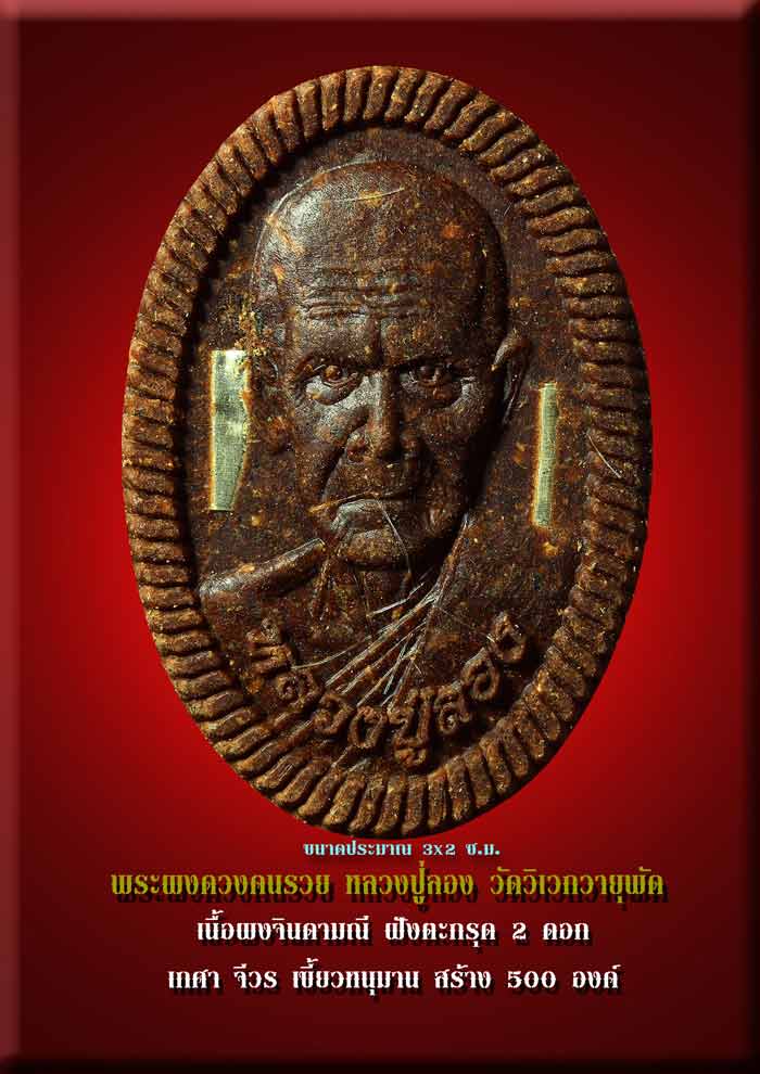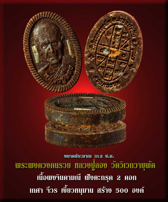 ด้านหน้ามี หลวงปู่ลอง ออกหน้าไปช่วยลูกศิษย์นอกวัด ด้านหลังนี่สำคัญ ดวงชะตา กำเนิดคนจะรวย ดวงชะตาเศรษฐี ความสำเร็จ ความรุ่งเรือง ความรุ่งโรจน์ อำนาจบารมีกำลังมาพร้อมกับพระผงดวงคนรวย ใครได้พระผงดวงคนรวยไปแล้ว หลวงปู่ ขอนิดเดียว ทำบุญ ให้ทาน ที่ไหนก็ได้ ขอเพียงมีใจเป็นกุศล ยิ่งทำยิ่งได้ยิ่งให้ยิ่งมี เป็นเศรษฐีมีกินมิรู้หมด ร่ำรวยมิรู้จน มีเงินมิรู้สิ้น พระเก่งๆ รู้เรื่อง ดวงชะตา เส้นวาสนา และอายุเกือบร้อย สร้างพระผงดวงคนรวย นี่ไม่ใช่เล่นๆ ท่านเก่งจริงรู้จริง ทำถึง จิตถึง พึ่งได้ เป็นของดี ของวิเศษที่ต่อไปภายหน้า จะดังแรง ดังใหญ่ หายากแน่นอน