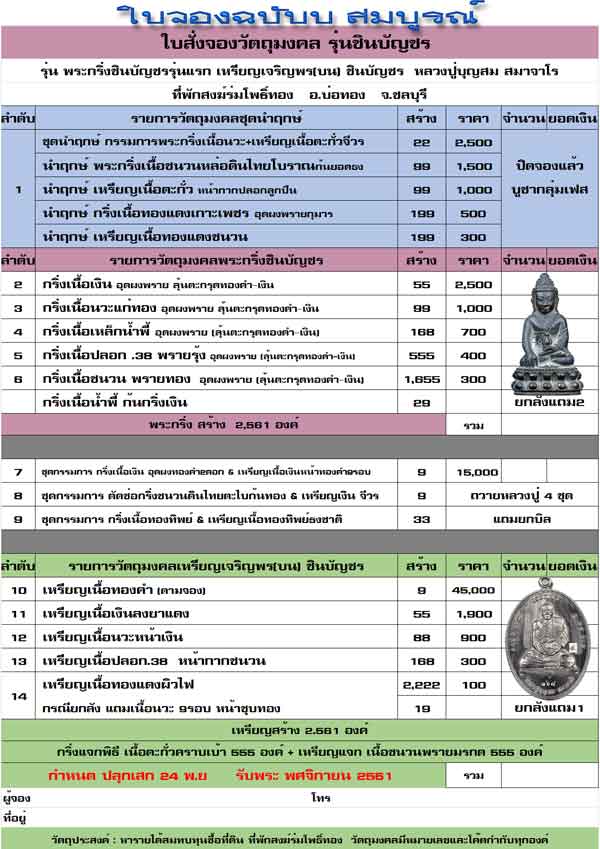 รุ่นชินบัญชร นี้ จัดสร้างเททองนำฤกษ์ จำนวนน้อยมาก และรายการจัดสร้างทั้งหมดดังนี้