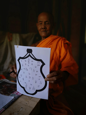 หลวงปู่ท่านออกเหรียญและลงเลขยันต์ ท่านออกแบบเขียนยันต์ใช้เวลานานมาก ๆ เขียนแต่ละตัว1-2 นาที และจะเสกทุกตัว ถือเห็นได้ยากยิ่ง