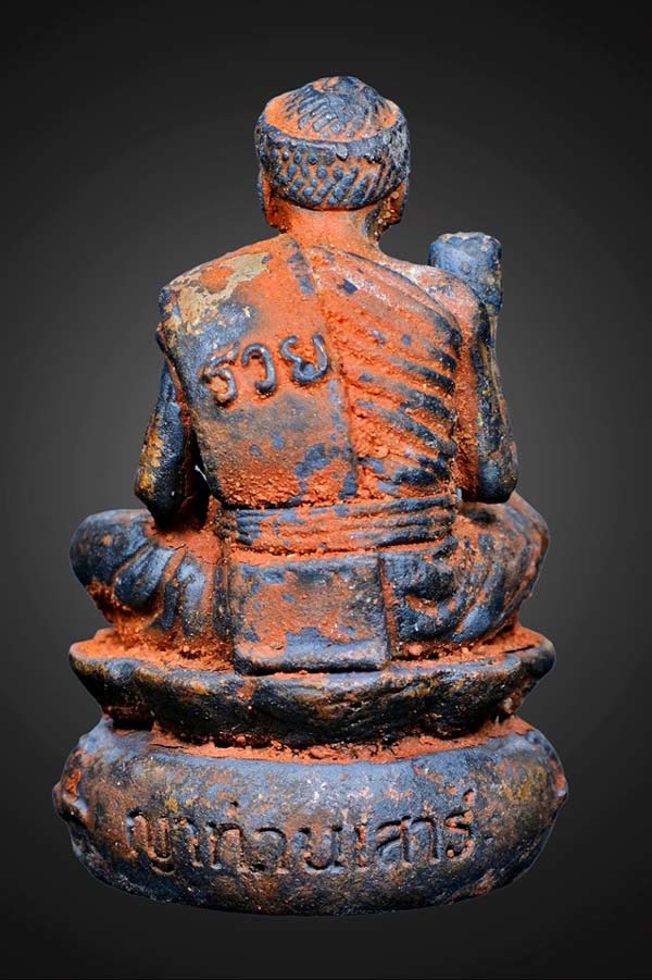 #มีคนมาขอให้หลวงปู่ สร้างรูปหล่อ รุ่นแรก ทั้งฝั่งลาว ฝั่งไทย หลายร้อยคนขอ หลวงปู่ก็บอกว่ายังทำให้ไม่ได้ เมื่อไหร่ที่ถึงเวลา หลวงพ่อสามองค์เกิด ค่อยทำ (พระสีสุก พระสีเงิน พระสีทอง ) เกิดพอดี หลวงปู่ อายุกาลล่วงเข้าวัย ๘๖ หลวงปู่ ว่า ถึงเวลาแล้ว นิมิตเห็นเทวดามาขอ หลวงปู่ ได้สร้างรูปหล่อท่านขึ้น ช่างปั้นก็ดีใจหาย ปั้นได้เหมือนหลวงปู่มากๆ ท่านกำหนดเอง นั่งเป็นแบบเอง ยกมือชูขึ้นกวักลาภใหญ่ นั่งอยู่บนถุงเงิน อุปมาให้มีสมบัติตักไม่พร่อง มีแมลงปอ สองตัว เป็นบริวาร (ประสบการณ์สูงมาก ) เกาะถุงเงินขนาบ ซ้าย ขวา หมายถึง อาหารการกินอุดมสมบูรณ์ตลอดปี ชักยันต์นะสารพัดนึกลงสังฆาฏิ ด้านหลังให้ รวย ตลอดชาติ ใต้ฐานเจาะก้น บรรจุ เกศา ผงจักรพรรดิ อุดปฐวีธาตุ ( หรือแก้วนาคราช ธาตุกายสิทธิ์ ที่หลวงปู่ได้มาตอนธุดงค์ ) บางองค์อุด เม็ดทองเอก ที่เหลือจากบรรจุพระผงแมลงปอแปดอรหันต์