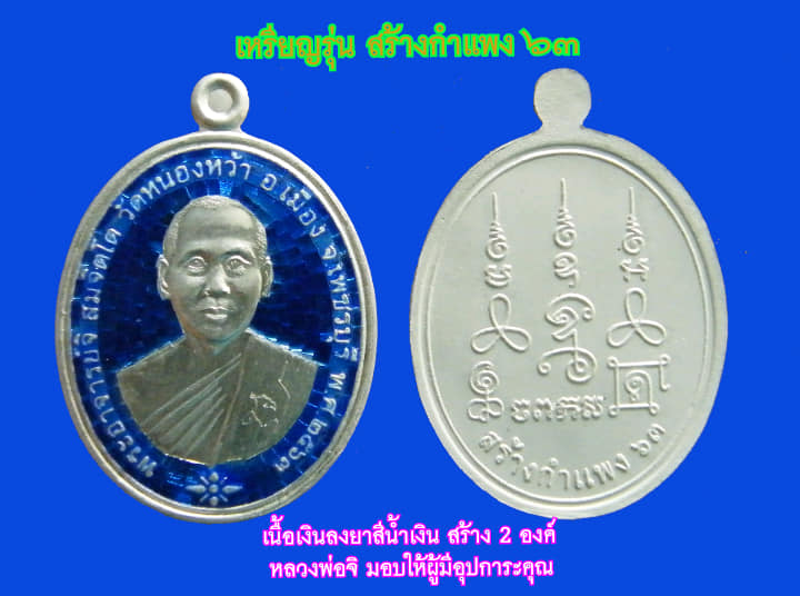 ...2) เนื้อเงินลงยาสีเหลือง และสีน้ำเงิน สีละ 2 องค์ ลพ.จิ จารยันต์ที่สังฆาฏิ สร้าง 4 องค์ (เป็นเหรียญที่ทางโรงงานทำถวาย ลพ.จิ) หลวงพ่อจิ ท่านมอบให้กับผู้ที่มีอุปการะคุณ