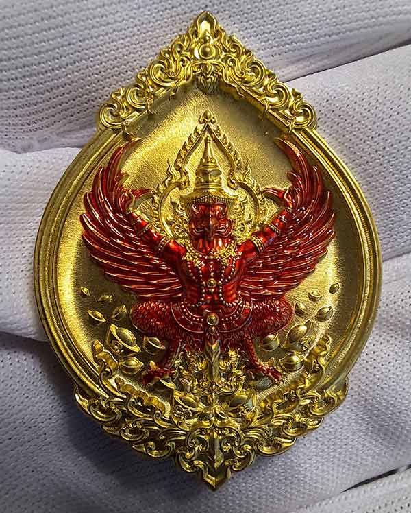 เนื้อทองทิพย์ ลงยาองค์ครุฑแดง + ปีกแดง ตอกโค๊ตและหมายเลขกำกับทุกเหรียญ พญาครุฑ รุ่นดวงเศรษฐี หลวงพ่อรวย วัดมาบตาพุด จ. ระยอง
