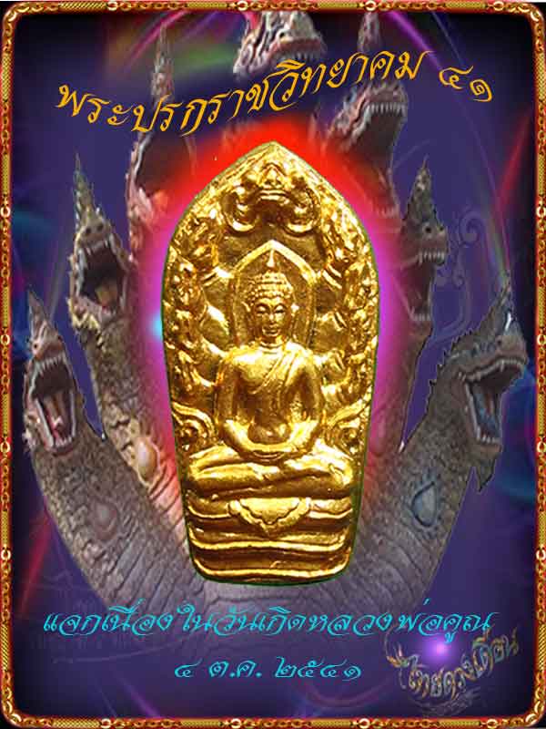 ประมาณต้นปี ๒๕๔๑ ที่บ้านคุณเชิดศักดิ์ ภูมิสวัสดิ์ จ.กำแพงเพชร เพื่อนๆ พี่น้องได้ไปพบปะสังสรรกันและได้ตกลงกันจะสร้างพระปรกใบมะขาม ลพ.คูณ (ขณะนั้น ลพ.ได้เลื่อนสมณศักดิ์เป็นพระราชวิทยาคมเถระ)แจกวันเกิด ลพ.คูณ ๔ ต.ค. ๔๑.....ช่วงเวลานั้น ลพ.คูณได้ให้คุณเชิดศักดิ์มาดูแลซ่อมแซมพระอุโบสถวัดมะระและได้สร้างพระเจดีย์บรรจุพระบรมสารีริกธาตุต่อ เพื่อนๆเลยตกลงให้พี่เชิดศักดิ์ขออนุญาต ลพ.คูณสร้างพระปรกราชวิทยาคม ๔๑ ในวันที่ ๑๔ มิ.ย. ๔๑ ที่วัดบ้านไร่..........คุณเชิดศักดิ์ได้กำหนดให้เป็นรูปแบบปรก ๙เพราะสร้างอยู่ในสมัยรัชกาลที่ ๙เพื่อจะได้เป็นสิริมงคลแก่คณะที่จัดสร้างจึงมีอีกชื่อว่า "พระปรกเก้า" โดยให้ อาจารย์สุพร ชนะพันธ์ เขียนแบบพระปรกขึ้นมาเสร็จแล้วส่งต่อให้คุณปัถม์ บุญรังค์ ขึ้นแบบปั้นขึ้นมาขนาดสูง ๔ นิ้วเพื่อใช้ย่อให้เล็กลงมาเท่าขนาดองค์จริง.............คุณพงษ์เชษฐ์ ปริสัญโญดมได้ดำเนินการติดต่อโรงปั๊มถึงยอดการจัดสร้างแต่ลัเนื้อรวมรายจ่ายทั้งหมดเป็นเงิน ๒๒๐,๔๐๐.-บาทโดยออกเงินสำรองจ่ายให้ก่อน....มีสร้างชุดทองคำ ๗๖ชุด(อายุ ลพ. ๗๕+๑+=๗๖) ทอง+เงิน+ทองแดง....เงิน ๕๐๐ องค์....นวะแก่ทองคำ ๕๘๐ องค์....ทองแดงไม่ตัดปีก ๓๐๐ องค์.....ทองฝาบาตร ๑๐,๐๐๐ องค์......ทองแดง ๘๔,๐๐๐ องค์.....ส่วนทองฝาบาตร ๑๐,๐๐๐ องค์พี่เชิดสร้างโดยบริจาคเงินส่วนตัว.........ชุดทองคำ 1 ชุด กำหนดให้ทำบุญชุดละ 2,900 .- บาท โดยช่วยกันทำบุญในคณะจัดสร้างและคนสนิทจนครบ 76 ชุดจึงได้ยอดเงินทั้งหมดมาจ่ายโรงงานในยอดจัดสร้างจ่ายทั้งหมดครบทุกเนื้อ ส่วนค่าใช้จ่ายเนื้อนวะ และชนวนแก่ทองคำเหรียญไข่ ๒ และเสมาเล็กของ ลพ.ไปล่ คุณพงษ์เชษฐ์บริจาคให้เป็นการส่วนตัว สรุปแล้วทีมงานจัดสร้างที่ทำบุญชุดทองคำ 1 ชุด จะได้เนื้อเงินอีก 5 องค์ นวะ 5 องค์ ทองแดงไม่ตัดปีก 3-4 องค์..........ในวันเกิดล.พ.คูณ พี่เชิดศักดิ์และคณะจัดสร้างได้ทำการแจกเนื้อทองแดงให้กับวัดที่สำคัญและที่รู้จักวัดละหมื่นองค์ เช่นวัดโคกรักษ์ วัดกุดม่วง วัดมะระ และวัดต่าง ๆ อีกหลายวัด วัดละพันสองพันองค์ และที่วัดบ้านไร่ แจกรวมทุกรายการในวันที่ ๔ ต.ค. ๔๑ วันเกิดลพ.คูณ อีกเป็นจำนวนมากครับ |