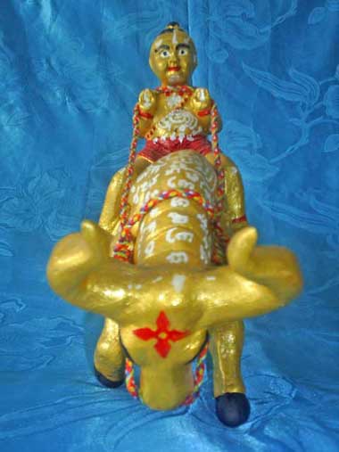 กุมารทองขี่วัว, กระทิง, ควาย ที่กล่าวมาเป็นรุ่นเดียวกันกันอยู่ที่ว่าช่างปั้นจะปั้นเป็นเขาแบบใด ส่วนองค์นี้ เป็นขี่กระทิง ไม่น่าจะมีมากสักเท่าไหร่ พอๆกับขี่ควาย จึงมีความนิยม และราคาสูงกว่า เป็นเนื้อดินเผา ปัจจุบันมีรุ่น2 แต่สร้างเป็นโลหะ รุ่นแรกหายากแล้วในปัจจุบัน (องค์นี้หลวงปู่แย้มเมตตา จารยันต์ให้ด้วยตัวท่านเองเลยทีเดียว) ถือว่าโชคดีครับ