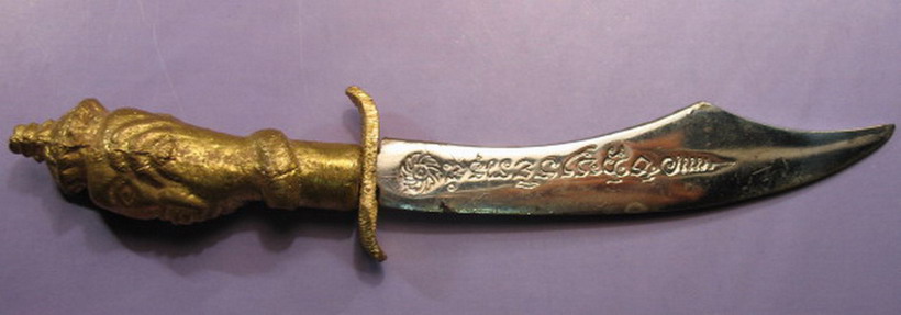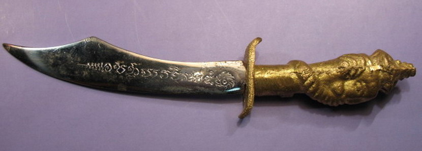 ...มีดครูเทพอาวุธ อาจารย์ชุม ไชยคีรี สายเขาอ้อสร้างปี2519 จากพิธีพรหมศาสตร์ รวม4นิกายและโยคีจากต่างประเทศ อินเดีย ลังกา และประเทศไทย รวมไสยศาสตร์108อาจารย์ หัวมีดทำเป็นเศียรพระพิฆเนศ บรรจุเม็ดกริ่งพิเศษตัวมีดเนื้อผสมด้วยเหล็กตามตำราคล้ายดาบฟ้าฟื้นของขุนแผนลงยันต์สัตราวุธทั้ง5สำเร็จเป็นเทพศัตราวุธมีฤทธิ์ อำนาจเหนือมนุษย์ มีอานุภาพทำให้ภูตผีปีศาจเกรงกลัว ติดตัวเป็นเครื่องกันอาวุธดุจเครื่องรางของขลังอื่นๆเป็นมีดครู คู่มืออาจารย์ไสยศาสตร์ หมอเฒ่า หมอยา อาจารย์ของนักสถาปัตยกรรม ศิลปกรรม เป็นเทพบรมครูการช่างทุกชนิด ใช้ทำพิธีแก้และกัน อุบาทว์ เสนียดจัญไร ขับไร่ภูตผีปีศาจ ทำน้ำมนต์แก้คุณถูกกระทำ ตัดและถอนไสยที่เขากระทำไว้ ใช้เป็นองค์ประธานในพิธีต่างๆเพียงแต่ระลึกถึงองค์พระพิฆเนศ เทพบรมครูแล้วว่าโอมพิฆเณศายะนะมะหลายๆจบนอกจากนั้นแล้วเราก็พูดขอพรหรือว่าคาถาอื่นๆเป็นต้นว่าโองการท้าวสหบดีพรหมองค์การเชิญครู แล้วแต่จะเหมาะสมกับเหตุการณ์นั้นในพิธีการนั้นๆขนาดยาง15ซ.ม.การบูชาตั้งไว้ประจำบ้านเรือนร้านค้ากันไพ่กันโจร กันถูกกระทำคุณไสยศาสตร์กันได้ทุกคนในครอบครัวควรตั้งไว้หน้าพระหรือใส่พานตั้งไว้ที่สุงๆบูชาเป็นมหาเทพเป็นเทพบรมครูความขลังจะเพิ่มทวีขึ้นตามอำนาจความเชื่อถือแต่ละคนที่เรียกว่ามีแรงครูสุงที่สุงกว่าเทวดาและมนุษย์ทั้งหลายขอกรรมสิทธิ์จงมีแด่ผู้ใช้ทุกคน สภาพสวยเดิมมี2เล่มครับ หายากครับไม่ค่อยมีให้เห็น บูชาเล่มละ 2,500 บาท |