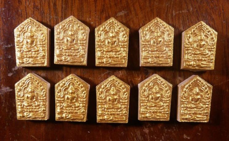 พระขุนแผนยอดฉัตร เนื้อผงพราย ทาทอง ไม่มีตะกรุด พิมพ์เล็ก 10 องค์ องค์ละ 250.- ยกชุด องค์ละ 200.-