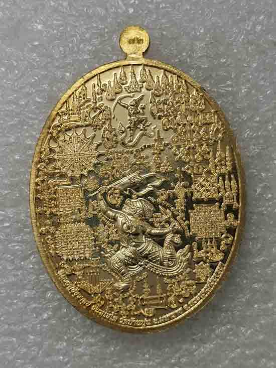 ด้านหลังเหรียญ เป็นยันต์หนุมานเชิญธง ล้อมด้วยมหายันต์อันวิเศษ ทั้ง 108 ประการ