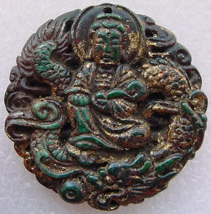1....เป็นหยกรูปเจ้าแม่กวนอิมประทับมังกร เนื้อหยกสีเขียวเข้มแท้ๆ ลงชาดจีนปิดทองเดิม เก่ามากๆ ขนาดเส้นผ่านศูนย์กลาง 5 ซ.ม. สภาพสมบูรณ์ ต้องบอกว่าแกะได้สวยงามอลังกาลงานสร้างมากๆครับ...